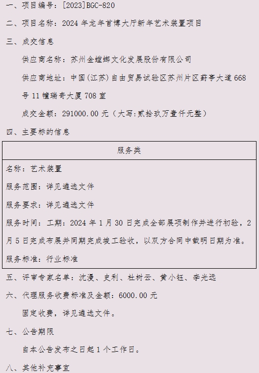 2024年龙年首博大厅新年艺术装置项目成交结果公告