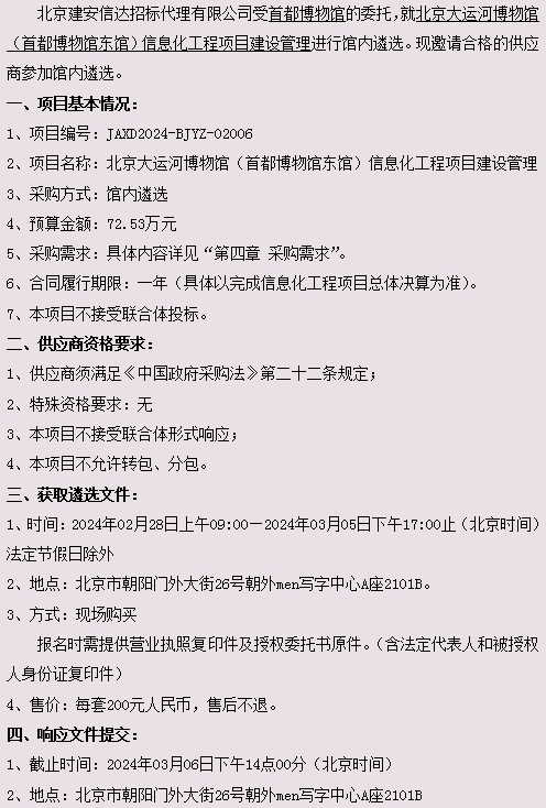 北京大运河博物馆(首都博物馆东馆)信息化工程项目建设管理馆内遴选公告