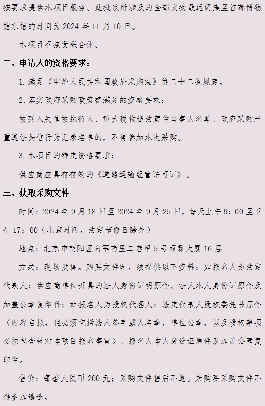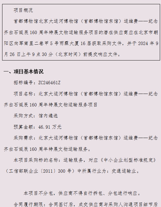 首都博物馆北京大运河博物馆(首都博物馆东馆)运维费——纪念齐白石诞辰160周年特展文物运输服务项目