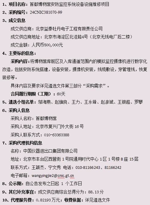 首都博物馆安防监控系统设备设施维修项目(二次)成交公告