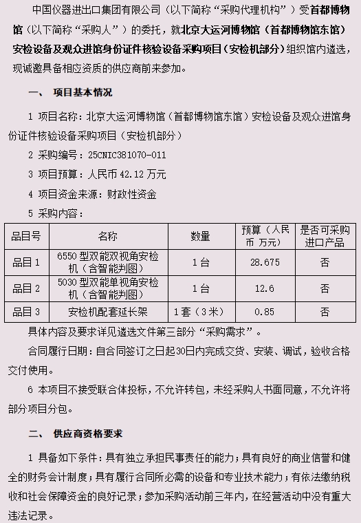 北京大运河博物馆(首都博物馆东馆)安检设备及观众进馆身份证件核验设备采购项目(安检机部分)公开遴选公告