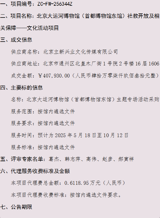 首都博物馆北京大运河博物馆(首都博物馆东馆)社教开放及相关保障——文化活动项目成交结果公告