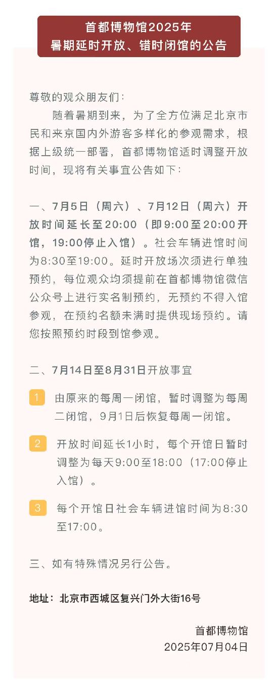 首都博物馆2025年暑期延时开放、错时闭馆的公告