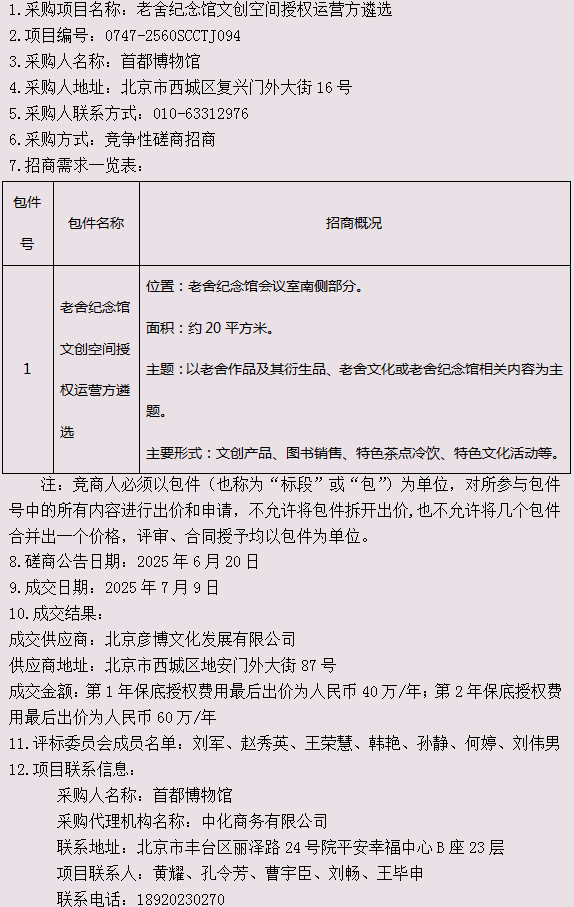 老舍纪念馆文创空间授权运营方遴选成交结果公告