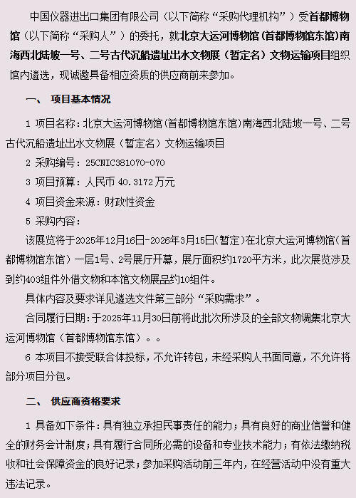 北京大运河博物馆(首都博物馆东馆)南海西北陆坡一号、二号古代沉船遗址出水文物展(暂定名)文物运输项目公开遴选公告