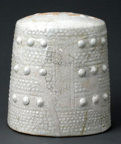 造型仿青铜镈。器外壁分三层饰细乳丁状地,间隔饰三排乳丁,器顶部有饰纽痕。通体施白釉。