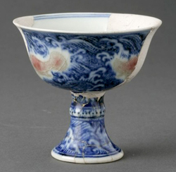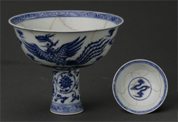 撇口,弧壁,柄足下部微外撇,杯腹饱满。外壁绘青花一凤一凰,间饰折带云纹,下部饰变形莲瓣一圈。足绘缠枝莲一周,足底部与杯内口沿饰卷草一圈。杯内壁亦印有同样祥云凤凰纹,杯心绘折带云。