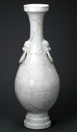 盘口,长颈,深腹,足作三层台式。瓶颈下部两侧各饰一衔环铺首。通体施甜白釉,仅足内无釉。