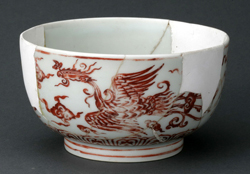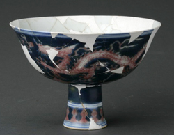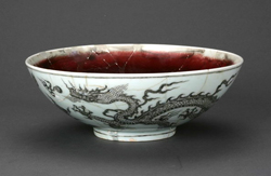 直口,曲壁,圈足。外壁釉下用铜红料绘赶珠龙两条,隙地饰以朵云。内施红釉。外底心隐约可见双圈刻款。
