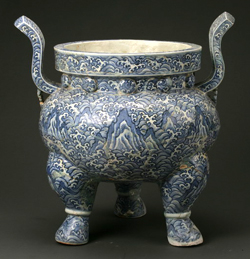 束颈,鼓腹,兽形腿。颈部饰以鼓丁,双耳呈“S”形,耳与腹部连接处饰有朵云状雕件。通体绘青花山石海水。