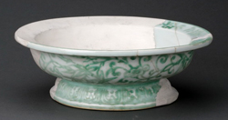 该器托外壁用低温铅釉绿彩绘灵芝、竹叶纹。足部饰一圈变形莲瓣纹,内口沿绘朵花一周。
