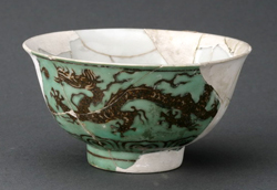 此碗为高温烧成后在外壁露白处填以低温铅绿釉,再低温(约700℃-800℃)焙烧而成。集高、低温彩饰于一身,开启了宣德青花填黄、青花填(矾)红装饰的先河。