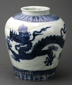 唇口,短颈,丰肩,浅圈足。肩部及底部各绘蕉叶一周,罐身用青料绘戏珠五爪龙纹,地刻海浪纹。