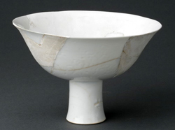 侈口,斜弧壁,柄足底部微外撇。通体满施甜白釉,足内亦满釉。外壁无纹饰,内壁印缠枝莲一周。盏心印有“永乐年制”四字双行篆书款,款外饰变形莲瓣一周。