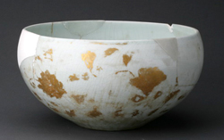 敛口,腹下部内敛,平底。内外施白釉,釉面有开片,外壁饰金彩缠枝花卉。