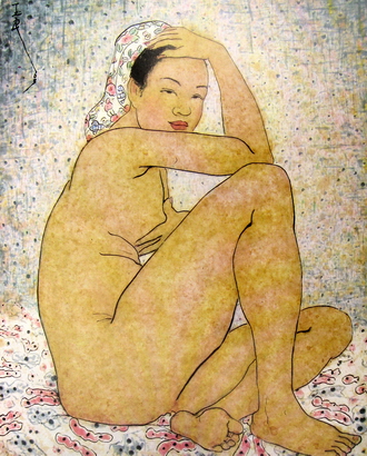 潘玉良在学习西方绘画的同时,没有丢掉中国绘画的传统,在她的画面上很容易发现东方艺术的装饰色彩和装饰元素。《双女扇舞》中一红一绿两个人物的服装,不难找到苏州桃花坞年画的装饰色彩。在《幸福的哺乳》中则戏剧性地设计了一个海滩上母子小憩的场面,在母亲和孩子的身下细心地描绘了一张装饰性极强的印花布。尽管没有明显刻画出母与子五官面貌,但是画家已经给作品打上了无庸置疑的东方烙印。同样,在其他的人体作品中,很多背景都被处理成图案装饰。在潘玉良的作品中,还有很多作品用中国的笔墨形式加上西方的绘画语言相结合,画家为后世提供了考察当时文化艺术西学东渐的许多线索,这也成为当代艺术史研究潘玉良及其作品的一个价值所在。