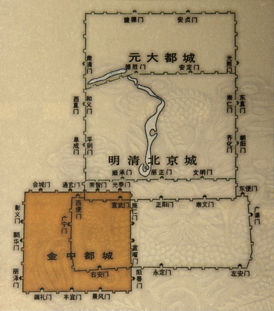 金取代辽后,金海陵王完颜亮于天德五年(1153),从上京迁都燕京,改名为圣都,不久又称中都。元灭金后,忽必烈于至元四年(1267),在东北郊外以积水潭为中心另建新城,为北京城奠定了基础。至元八年(1271),定国号为“大元”。次年,忽必烈改中都为大都,并从上都(仿内蒙古正蓝旗上都郭勒)迁都于此。
