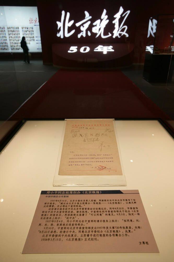 展柜中的100多件实物中,不乏珍贵史料,如1957年邓小平同志同意创办《北京晚报》的批示就是首次公开亮相,1964年毛泽东同志为《北京晚报》题写的报头,2001年《北京晚报》记者带回的“入世槌”的复制品等,则清晰记载了经历半个世纪《北京晚报》一路走来的足迹。