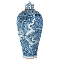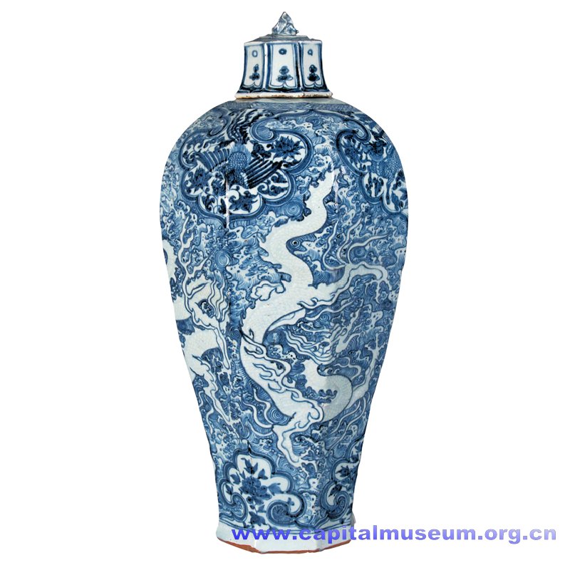 河北省博物馆藏 身绘青花海水及火焰纹,用留白手法饰飞舞在波涛汹涌的海水中游龙四条;肩及胫部饰如意形云纹,内绘青花花卉、凤鸟和怪兽,形象对比鲜明,白地蓝花与蓝地白花相映成趣,又极富艺术感染力。 |