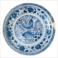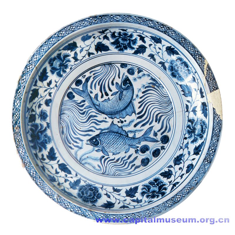 青花莲塘双鱼纹折沿圆口大盘 湖南省博物馆藏 盘沿面饰以细线条描绘的海水纹,盘心画鳜鱼、鲂鱼各一,游嬉于荷池水藻之中,莲花、水草似随水波而动,极具动感。外围环以缠枝牡丹,花叶缠绕,叶片丰腴。整个画面安排得当,疏密有序,绘画精细。图案以进口青料绘制,发色浓艳。 |
