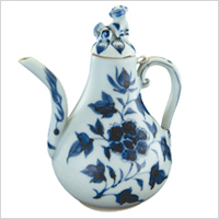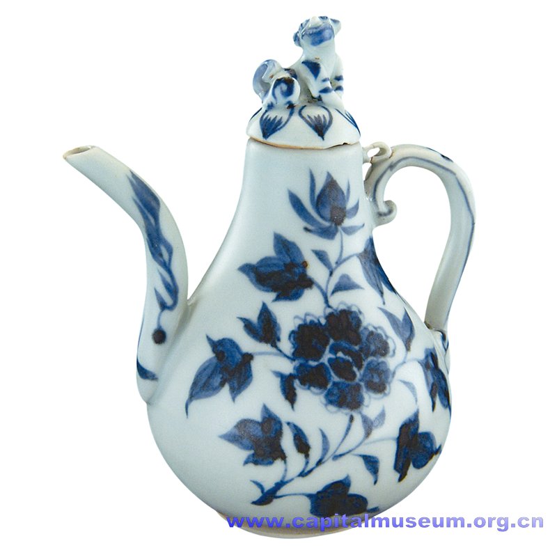 内蒙古自治区文物考古研究所藏 壶身饰缠枝牡丹纹,流饰火焰纹,盖饰小狗,生动逼真。青花色泽艳丽,浓淡相宜。该壶造型活泼轻灵,装饰别致典雅,体现了高超的制作技术。 |