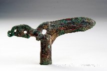 虎内带銎铜戈 战国 短胡,弧刃,援中为浅凹槽,有“S“形纹饰,下有椭圆形銎,上有连贝纹带,内有一伏虎,口衔援后部,曲身长卷尾。