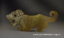 虎形玉佩饰 西周 北京大学赛克勒考古与艺术博物馆藏 器身一面用阴线区分出头、颈、躯干和尻部,再用阴线刻画出眼、鼻、耳、口、腿、爪等细部特征。另一面光素无纹。这件虎形配饰虽然出自西周早期墓葬,但却表现出浓重的商代风格。臣字虎眼、巨口利齿等风格,从而不排除为商代遗留物的可能性。 |