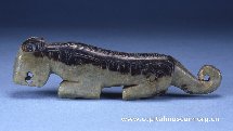 玉虎 西周 洛阳市博物馆藏 玉虎作爬卧状,头下垂,咧口,竖耳,尾上卷,背刻纹饰,耳部为卷云纹,背为平行波折纹,两侧腹部为瓦纹。青玉质,背部为黑色。 |