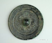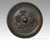 “青羊作”龙虎铜镜 汉 洛阳市博物馆藏 镜作圆形。镜背圆钮,圆钮座。座外浮雕一龙一虎对峙,两者头部间置一枚“五朱”钱纹,龙虎昂首张口,曲颈盘绕,后躯压于钮下,肢尾外露,龙后侧有“青羊作”三字铭。其外饰两周弦纹和一周射线纹。宽镜缘上依次为锯齿纹、弦纹和双线波折纹。 |