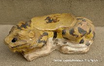 黄釉虎形枕 宋 洛阳市文物工作队藏 该件虎形枕作卧虎状,虎头、尾、爪大致塑出轮廓,虎纹、虎尾、眼耳鼻口以及背上的图案均用彩绘来表现,所谓“三分塑,七分绘”。虎身为伏卧状,四肢蜷卧于地,虎头叠于卧地的前爪上,虎身以黄底黑彩相间的条状纹来表现虎斑,用墨笔画出口、眼、鼻、耳等部位。 |