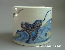 釉里三彩龙虎斗笔筒 清康熙 北京艺术博物馆藏 笔筒是文人书案上的常设之物。此件造型为口底相若、上下略撇、腹壁微束的直身圆筒形。玉璧形平底。通体以青花、釉里红、豆青三色绘画龙虎图案,并在胎上刻划云气纹。画面动静结合,简洁精妙。 |