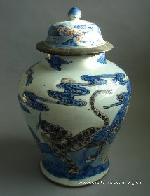 釉里三彩龙虎斗将军罐 清康熙 北京艺术博物馆藏 此罐因附珠宝顶盖形似将军盔帽而得名。整体造型浑圆高大。通体以青花、釉里红、豆青三色绘画龙虎纹,图案生动传神。 |
