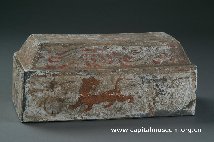 彩绘虎纹陶方奁 西汉 洛阳市博物馆藏 奁(lian),古代盛梳妆用品的匣子。该件方奁上部为梯形,下为长方体均施粉地。上部以褐红色粗线饰云气纹,下方形面亦饰褐红色粗线条铺首啣环。主体纹饰为一奔走的猛虎。 |
