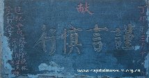 谨言慎行 1927年 北京文博交流馆藏 说明:此匾在诸多牌匾中式最为特殊的一块。从匾左手落款便可知此匾为殿佑臣、周建安等七人受罚时所捐赠的。按梨园行的规矩,农历三月十八日为戏子和官工日期,这一天要祭祖师爷,而且不准唱戏,决不许违犯。违犯者要受到惩罚。受罚人捐此匾以警示自己日后勿再犯。 |