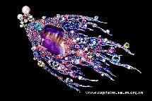 鱼儿的梦 | 胸针 七彩神仙鱼是以钛金属铸造而成,整件作品线条流丽,鱼身镶满不同颜色的蓝宝和彩钻,闪烁迷人,如幻如真,仿如日光下的鳞光闪闪。尤其是鱼鳍及鱼尾部分,犹如立体雕塑,这是从传统的阳雕演化而来。从以往的雕刻作品中可见,作者十分留意作品的三维空间设计和运用,不论从哪一个方向看作品,都是精雕细琢,就连珠宝作品,亦秉承了设计师一贯的雕刻技术和手法。 除此之外,神仙鱼的中央是以一颗紫晶为主题;紫晶中间刻有一座城堡,喻意鱼儿之梦乃寻找家乡乐土。而这座城堡是陈世英独创的「幻影雕刻」,以阴雕和内雕的技术,配合采光的技巧和色彩的运用,将一座水底城堡在波光水影之下呈现眼前。 |