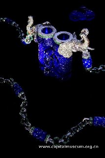 御前赛宝 | 项链 设计师采用了出自乾隆朝代的古董琉璃鼻烟壶,以无限的创意,在鼻烟壶的两旁加镶一对象,寓意「太平有象」。全个象头都镶满钻石,而双眸和鼻子内侧则以红宝和黄钻点缀,不但令整个作品更具神韵,亦令古雅的琉璃鼻烟壶增添一份华丽的气派。 此外,设计师亦特意于鼻烟壶开合的位置加上两个镶有钻石和绿榴石的圈子,令鼻烟壶能紧扣盖子,解决原来壶盖易脱的问题。最后,设计师为鼻烟壶以青金石和钛金属装成项链,更以钻石及绿榴石作装饰点缀。整件作品,透过陈世英独到的眼光、过人的手艺,将古董琉璃鼻烟壶、钻石象头、青金石项链打造成浑然为一、互相辉映的稀世珍品,令原先已甚具收藏和鉴赏价值的珍品,进一步演化成当代的艺术珍藏。 |