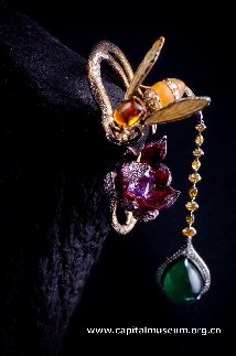 光阴年华 | 耳环 岁月如流,人生如白驹过隙,但甜密的一剎那恍如陈年佳酿,令人回味无穷。以黄晶打造的蜜蜂碰上嫣红的莲花,就如君子遇上梦里伊人,总想一亲香泽,却又心如鹿撞,觉得伊人可望而不可即。垂挂着的绿宝就如一股清泉,呼应着这份纯纯的爱。 |