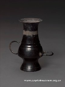 蛋壳黑陶双耳尊 龙山文化 庞运华捐赠 蛋壳黑陶是山东龙山文化最具有代表性的陶器品种。此类陶器器壁最薄处仅为0 .2-0.3毫米,质地却极为坚硬,反映了当时高度发达的制陶水平。由于保存十分不易,很多黑陶器物在出土时已成碎片。而这件捐赠首博的蛋壳黑陶双耳尊不仅保存完好,而且做工精细,非常少见。