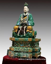 三彩元始天尊像 明 徐展堂捐赠 元始天尊为我国道教最高尊身之首。此件塑像形体硕大,保存完整,雕塑手法娴熟,装饰华丽,是山西琉璃窑典型代表作品。 徐展堂,香港收藏家,曾任全国政协常委、中国香港特区筹委会委员,执掌香港北海集团、新中港集团、城市巴士等数家公司。香港徐氏艺术馆创办于1991年,为香港第一家私人博物馆。(展品现于首都博物馆礼仪大厅展示)