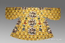 明万历黄缂丝十二章衮服 王嘉良工作室复制 明万历黄缂丝十二章衮服原件大量采用捻金线和孔雀翠羽线缂织,彩色绒线用色多达2 8种,制作曾耗时1 3年。由于时代久远,这件珍贵的缂丝衮服出土时已经破损、侵蚀得十分严重。为了能让这件缂丝衮服重现当初的华丽与尊贵,首博决定对这件缂丝衮服进行原貌复制。苏州刺绣研究所的缂丝创始人王嘉良和他的家族历时3年,本着还原历史、尊重史料的原则,采用各种传统缂丝工艺,完成了这件精美的复制品。 |