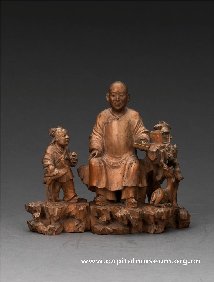 黄杨木人物摆件 此件黄杨木雕人物以书生和书童为题,形象生动,刀法细腻。背面有“乾隆丙子七月初九子时三佛堂翰列公郑宅生嘉庆戊辰金山县澈亭记”款。 |