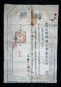 崇祥功牌 清 马金忠捐赠 功牌是清代为奖励在军事训练中表现出色的八旗兵丁而设立、颁发的凭证,相当于现在的荣誉证书。 崇祥,北京人,七品顶戴,清朝光绪年间任镶蓝旗满洲连清佐领下鸟枪护卫军。