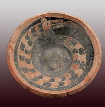 彩绘龙纹陶盘 通高9.0厘米 口径37.0厘米 礼器 陶寺文化早期(约公元前2300~公元前2100年) 山西省襄汾县陶寺遗址出土 这件彩绘龙纹陶盘出自陶寺遗址的大墓中,可能是当时“王室”使用的礼仪用品。从陶寺的龙纹陶盘开始,我国的龙形象的演变发展,延续至今。 |