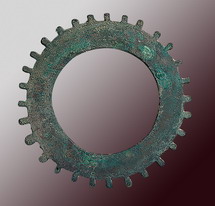 铜齿轮形器 外径12.5厘米 内径7.5厘米 陶寺文化中晚期(约公元前2100~公元前1900年) 山西省襄汾县陶寺遗址出土 这件齿轮形铜器与玉璧叠摞出自陶寺晚期小墓墓主手臂上,墓主胸前出有小玉璇玑。铜齿轮形器没有实用传动功能的29个齿牙,引发学者对其表现朔望月轮回功能的推测。也有学者认为其为钏饰。 |