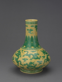 清代黄地绿彩的花瓶非常的稀少,主要以盘、碗等器形为多见。这件花瓶以黄釉为底,上有暗刻的绿彩龙纹,黄绿相间,华丽高贵。它对烧造工艺要求很高:先在胎上施绿彩,再以黄彩填地,绿彩的烧造温度不能高,如果过高,绿彩就会晕散,龙形便不复存在,因此制作这件花瓶在火候的掌握上是很难的。同时,这种瓶有一个重要特点:黄色的部分如果仔细观察,会发现上面有细微的凹凸不平,这是由于黄釉直接施在素胎上,烧成后釉面变薄而造成的。这件珍贵的黄地绿彩龙瓶在1976年的时候拍卖以 5万一对的价格成交,而2008年的时候仅一只的拍卖成交价格就飙升到了1800万。