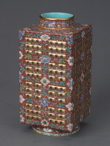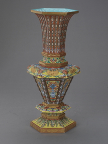 这件六角瓶是雍正晚期的一件作品,其风格豪华艳丽,器壁厚重,在肩膀上有繁复的雕饰,颜色也与传统色彩有明显的不同。在上世纪80年代,人们普遍认为雍正时期没有松绿彩,而这只六角瓶内壁就施的松绿釉,所以很多人都质疑这件作品的真伪。也因此,1982年英国佳士得拍卖3件一组的六角瓶的成交价仅为10多万元,而之后随着了解的加深,人们渐渐改变了认识,到了2009年,单只瓶的成交价就达到了 7000万。