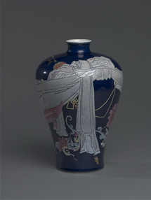 这是一件乾隆早期的作品,它在督窑官唐英主持下完成,风格颇有雍正时期的遗风。蓝釉的梅瓶从元代创始以来,历朝历代都有烧造,但本次展出的器物是蓝釉上加了粉彩烧造而成,这就很少见到了。而九吉祥这样的纹饰也非常少见,与这个纹饰一样器物全球只有三件。九吉祥以九种不同事物的谐音代表了不同的寓意,如瓶上绘有的包袱形象,则代表了“包福”的含义。在烧造技术上,器物上的色彩越多,工艺就越复杂,因为要考虑到不同色彩的受热温度,而这件器物上的每种颜色都稳定纯正,说明当时的烧造技术非常之高。