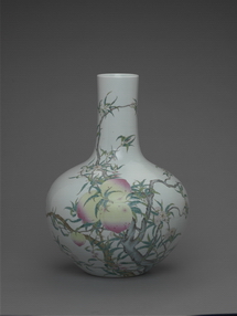 天球瓶造型始于明永乐时期,雍正、乾隆时再度盛行,是雍正、乾隆官窑的标准器物。而绘九桃,只有乾隆官窑最具代表性。桃在中国传统文化中是一种吉祥之物。传说桃木可驱鬼,桃实食之则可延年益寿,遂成为长寿的象征。"九"在中国传统文化中则是至尊之数,九桃绘于瓶上,寓意平安祥顺,万寿无疆。乾隆时期这种九桃天球瓶非常多见,其色彩艳丽,喜庆富贵,装饰效果尤为卓越。而本次展出的这件天球瓶是乾隆早期的作品,它的画工、颜色、款识都与乾隆盛期的作品有所区别,同时又与雍正时期的作品有很多相似之处。这次展览中我们也很难得地借到了一只雍正时期的八桃天球瓶可供观众对比品鉴。