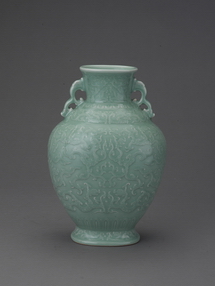 冬青釉是明永乐时所创。其特点是色泽较重,有宋元龙泉釉的效果,故又称“仿龙泉釉”。但随着时代的变迁,清代乾隆时期的冬青釉已超越了明朝甚至是康熙时期的作品,其整体颜色比豆青浅,釉薄而坚,肥润无开片,器里、器外均为一色冬青釉。从这件藏品来看,器型规整,釉面润腴,色泽清幽,暗刻的花纹和釉色相得益彰,给人一种玉的质感,体现出了清人不众不同的审美情趣。这件藏品于 1986年首次拍卖,以25万元的价格成交,然而在2004年,与它完全相同的另一只瓶就拍出了2000多万的高价。