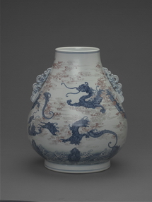 鹿头樽是清代雍正后期创烧的一种器形,一般表现为双耳是鹿头的形象,而这件器物确切地应该叫“双耳尊”。鹿头樽在乾隆时期最鼎盛,烧造数量最多,而雍正时期的比较稀有,瓶高50公分的这种大器形就更加稀有。在这件器物上,蛟龙穿梭于红色云朵之中,云朵浓淡相宜,表现了一种寿山石海的壮丽风景。这种龙的图案在历代的器物中也比较特殊,不同于以往的龙的形象。